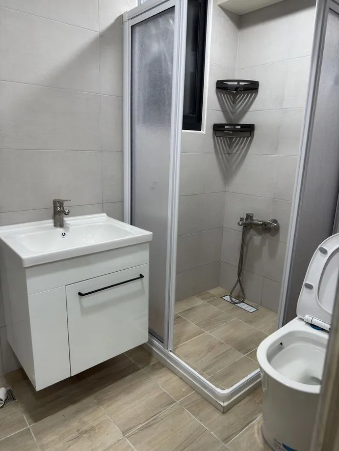 牆面貼上白色瓷磚,呈現出整潔明亮的效果。地面則鋪設了灰色地磚,為空間增添穩重感。窗戶安裝完成,提供自然採光和通風。牆面上標記了燈具和維修孔的位置,暖風機安裝點也已確定,為後續電器安裝做好準備。從此一案例可看出這間浴室雅致風格。